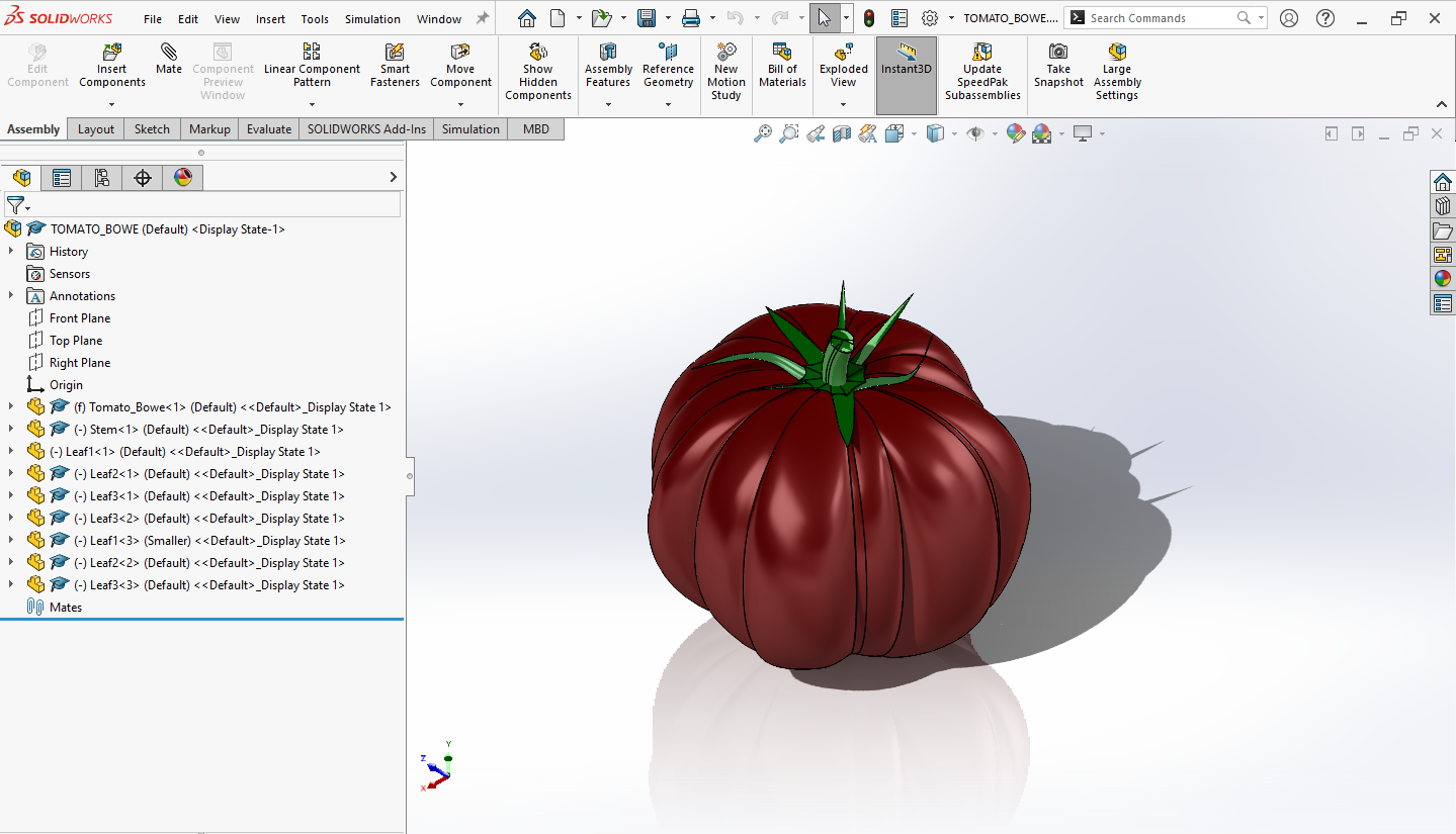 Everything was assembled in an Assembly, utilizing configurations to make smaller versions of the leafs, so I could save time modeling