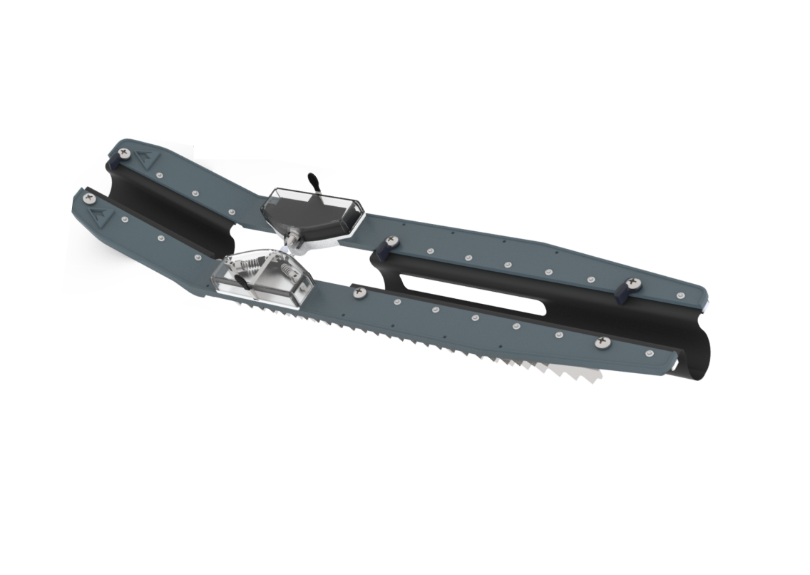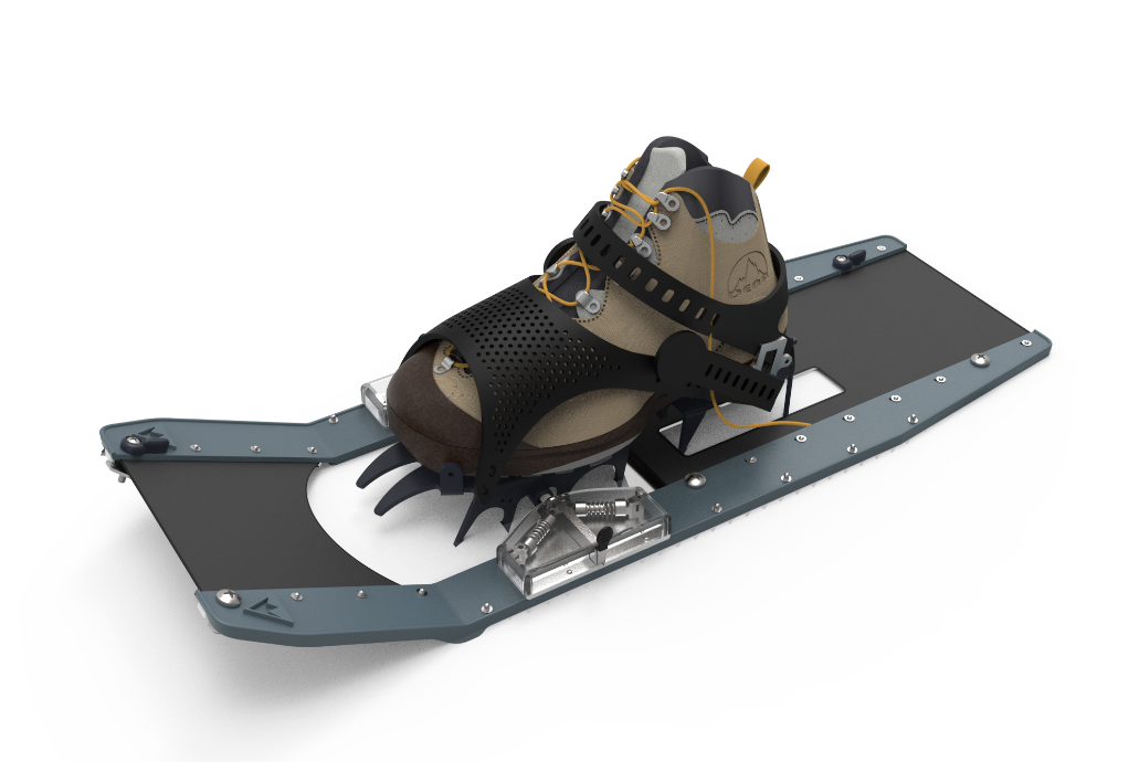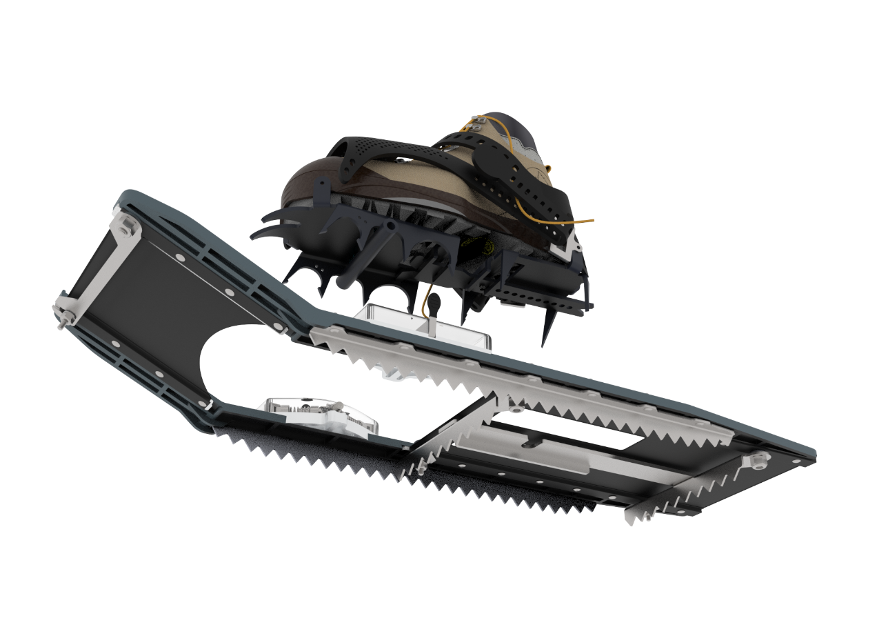 ORITREK is composed of a foldable snowshoe deck that can be attached to high performance crampons and folded for storage when not in use. The design incorporates cold weather fortified materials and optimizes portability without sacrificing strength. The bindings are composed of durable aluminum and polyurethane, increasing the support and security for the user while maintaining a low weight overall. The attachment mechanism between the snowshoe deck and crampon provides a quick-to-engage and strong connection that allows for the user to complete the switch without the need to sit down or take gloves off. ORITREK is the solution for anyone traversing cold weather climates.