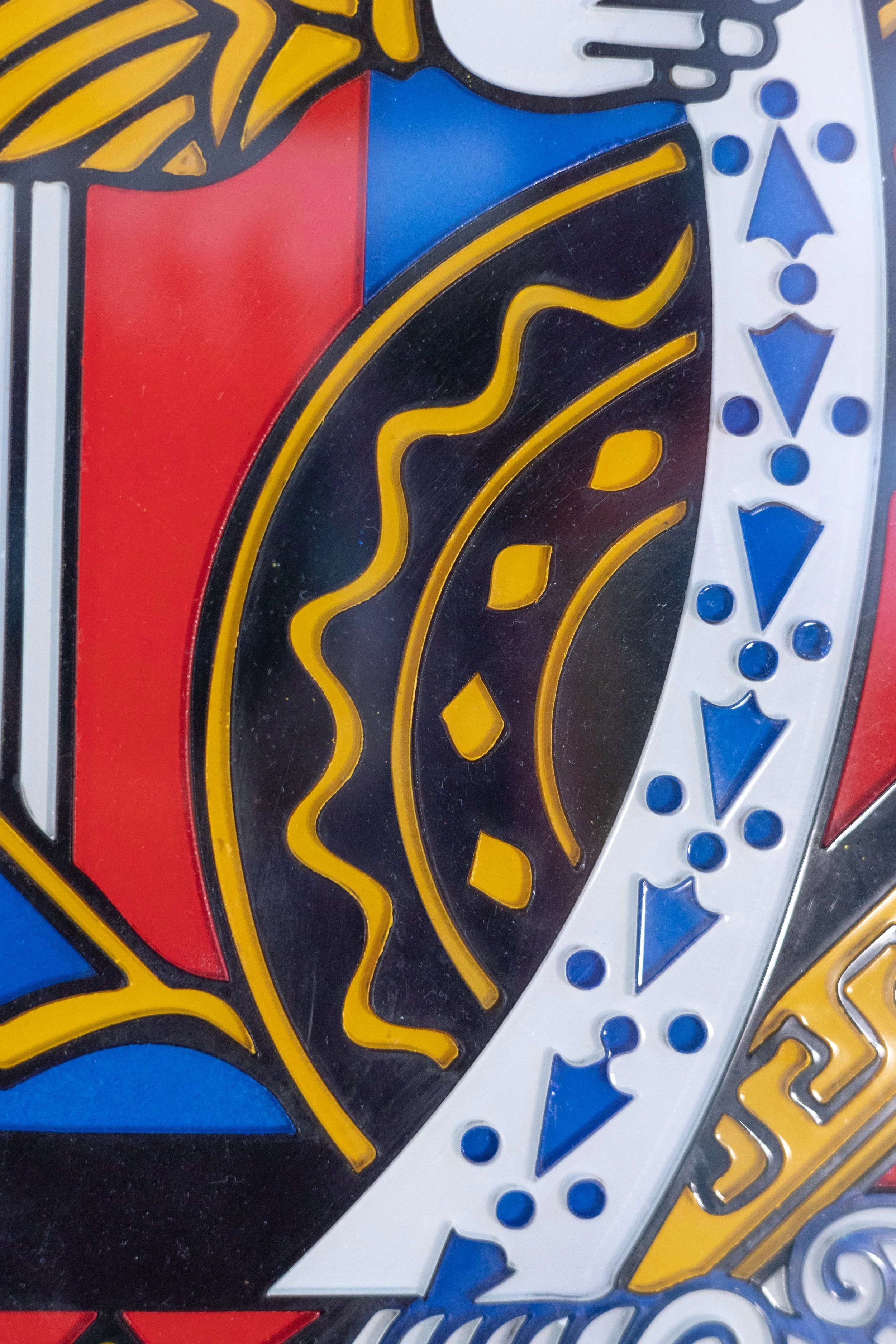 Designed in Rhino & Illustrator, by looking to an original playing card and customizing one side to relate to the story of the Suicide King